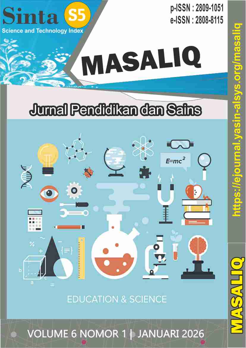MASALIQ: Jurnal Pendidikan dan Sains (p-ISSN: 2809-1051 and e-ISSN : 2808-8115) has been published in Vol. 5 No. 5, September 2025. Our hope with the publication of this journal can help readers to provide insight, ideas, references, in the development education and science. MASALIQ journal has been indexed by Sinta 5, Copernicus, Harvard University, Boston University, Dimensions, Scilit, Crossref, Garuda, Google Scholar, and Base. Masaliq Journal has authors from 3 countries (Indonesia, Nepal, and Japan).